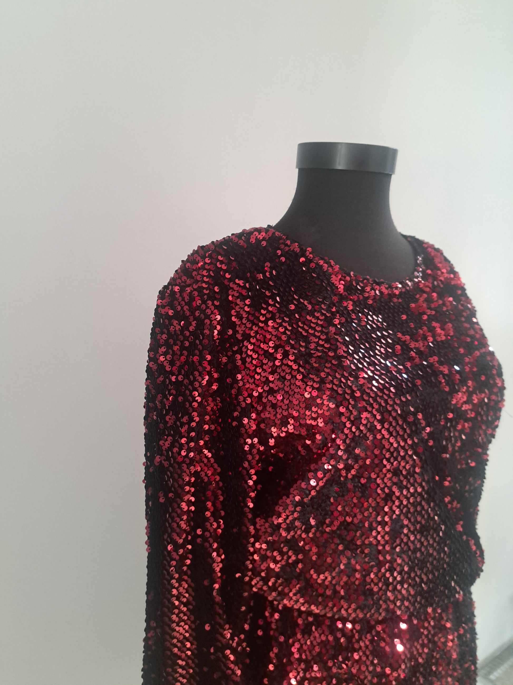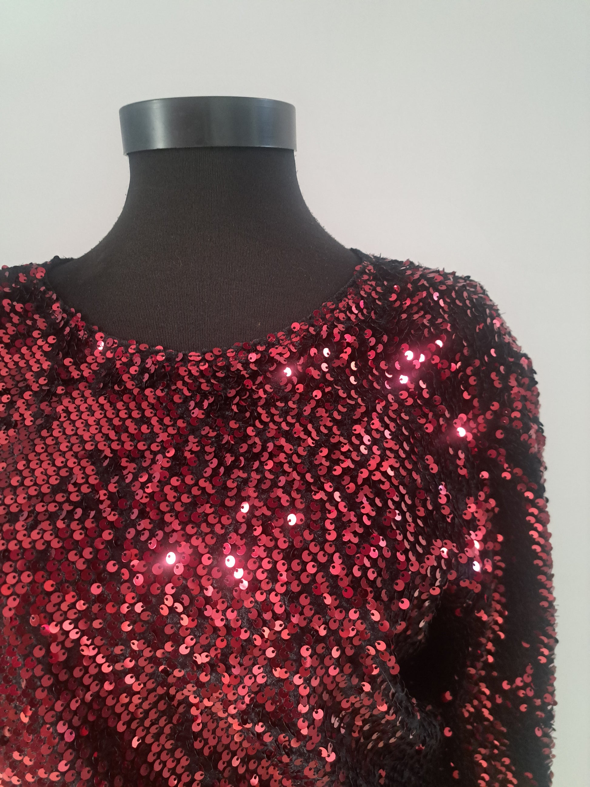Rochie șic din paiete, se bluzează peste elasticul din talie. Este potrivită pentru o petrecere cu firma sau pentru o ieșire în club. Este căptușită cu bumbac elastic.