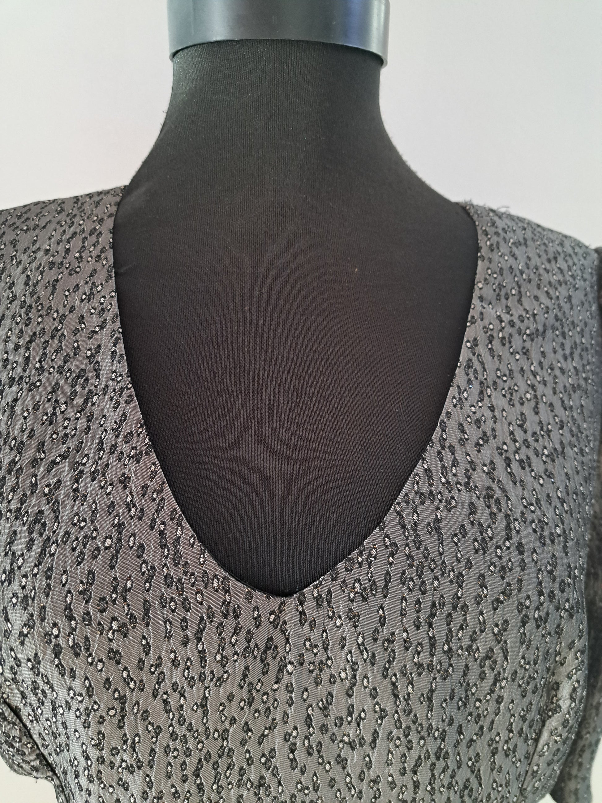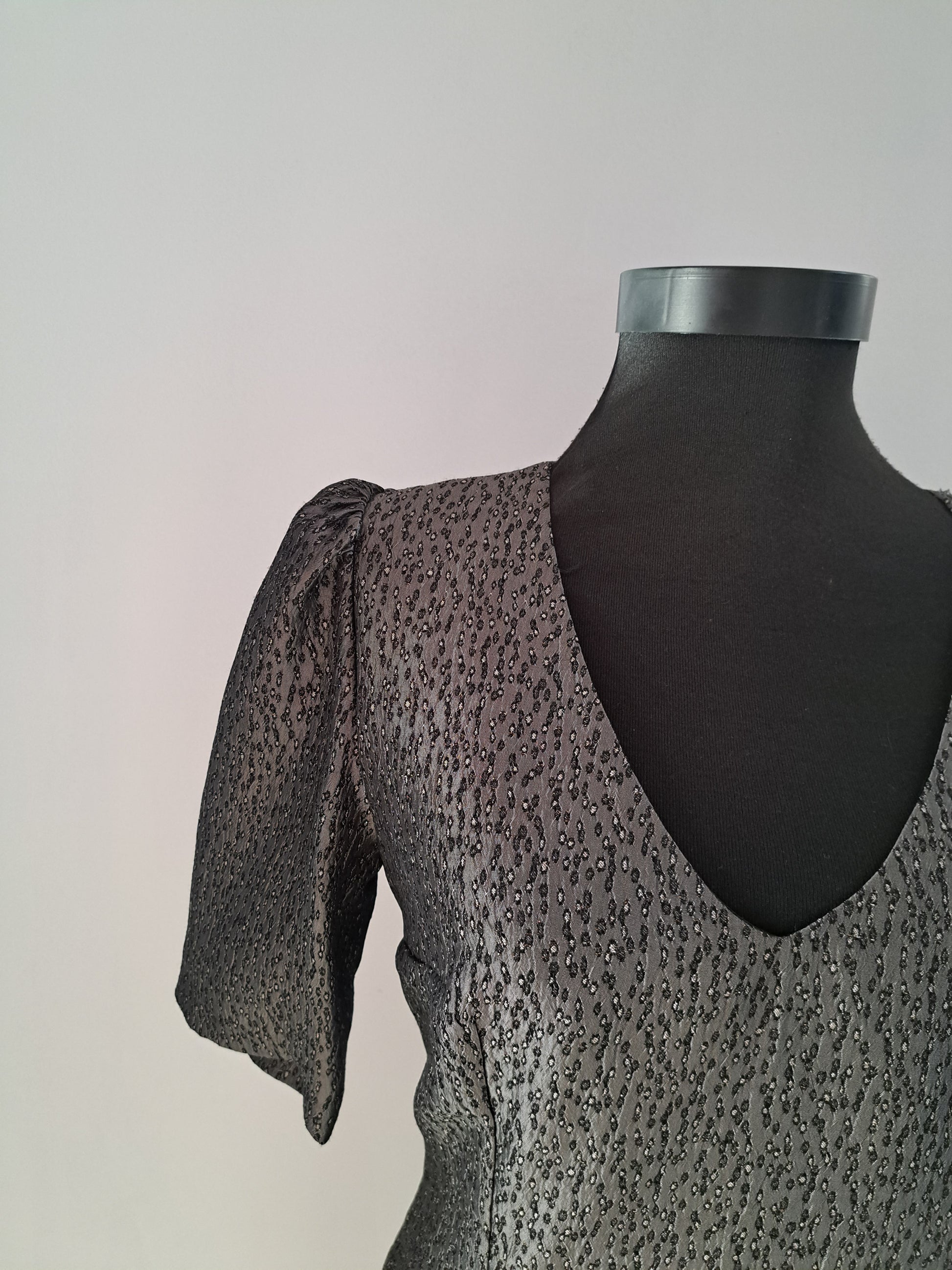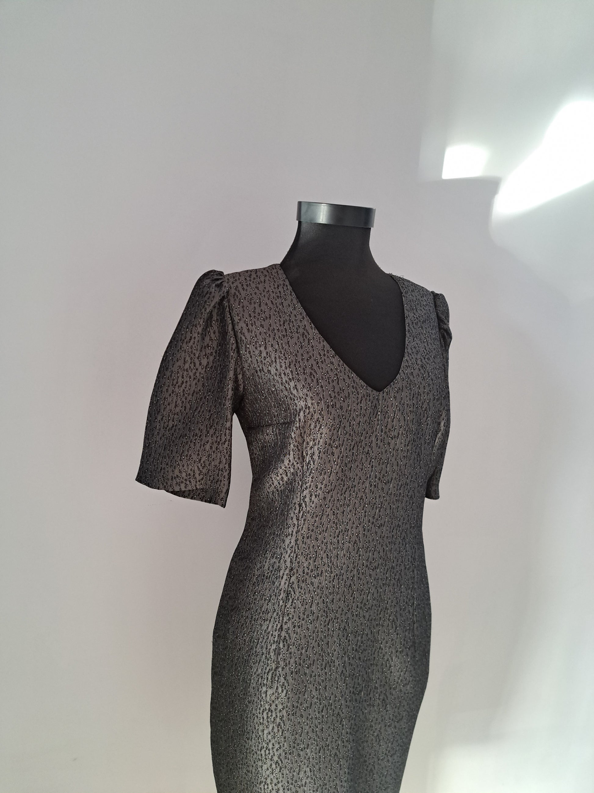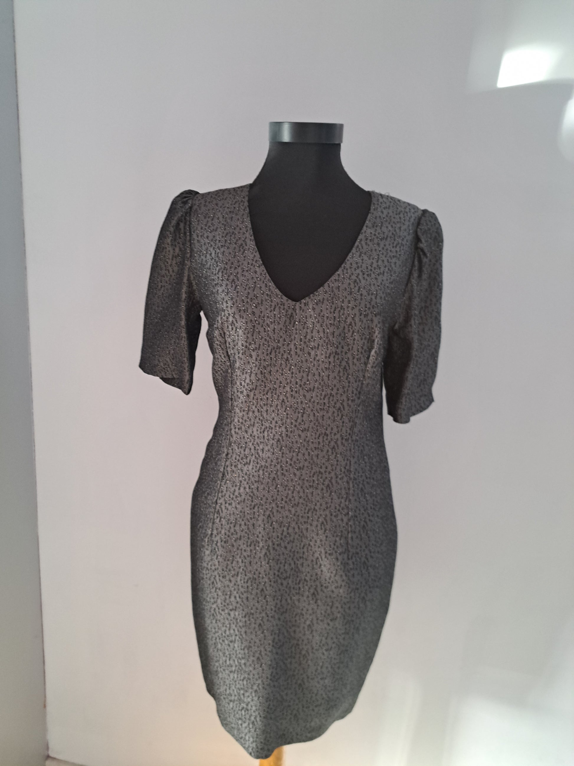 Rochie din brocart gri sidefat, croială conică, se încheie la spate cu fermoar ascuns. Este căptușită cu satin fin. Potrivită pentru o ocazie specială din viața ta.