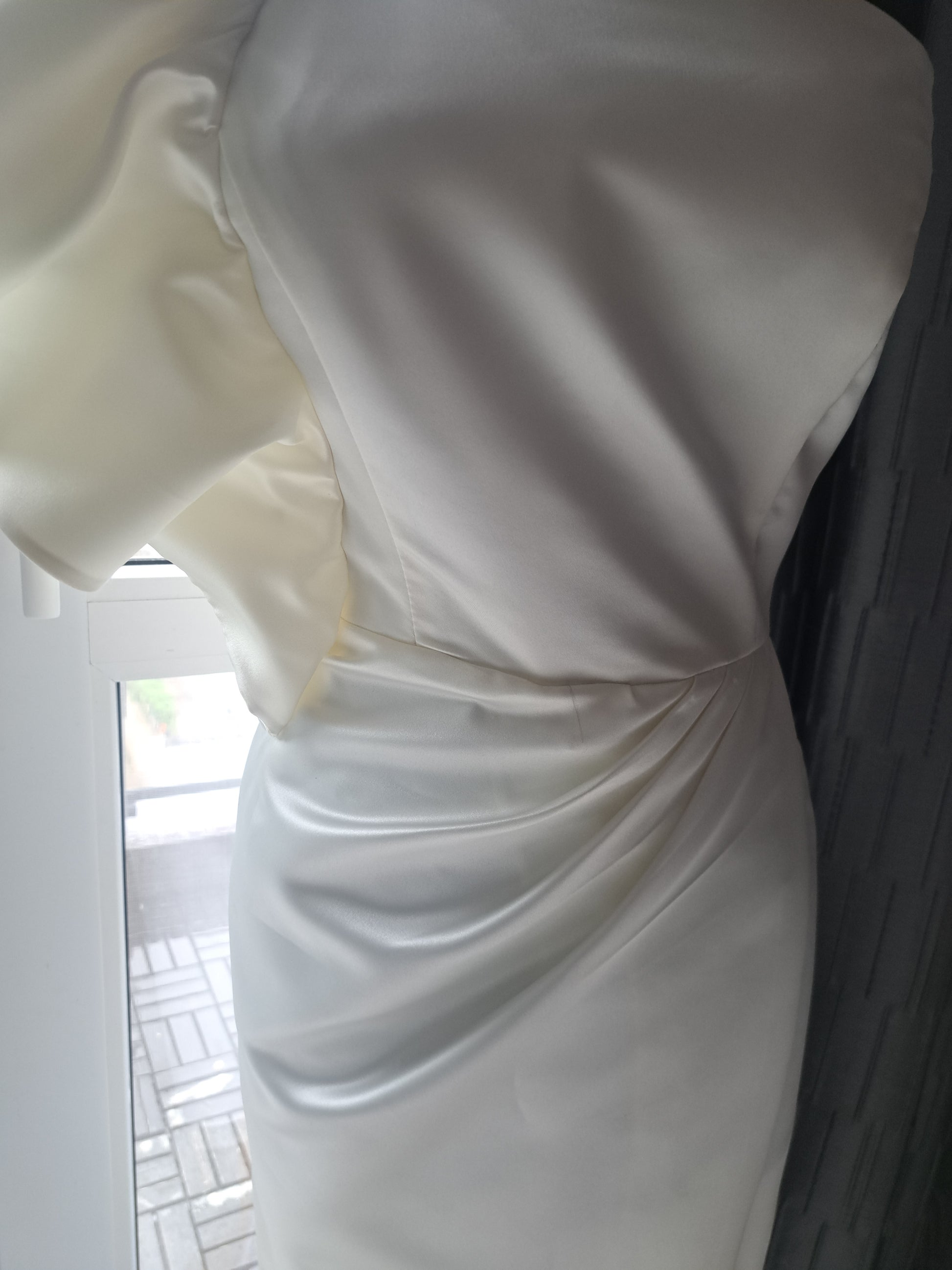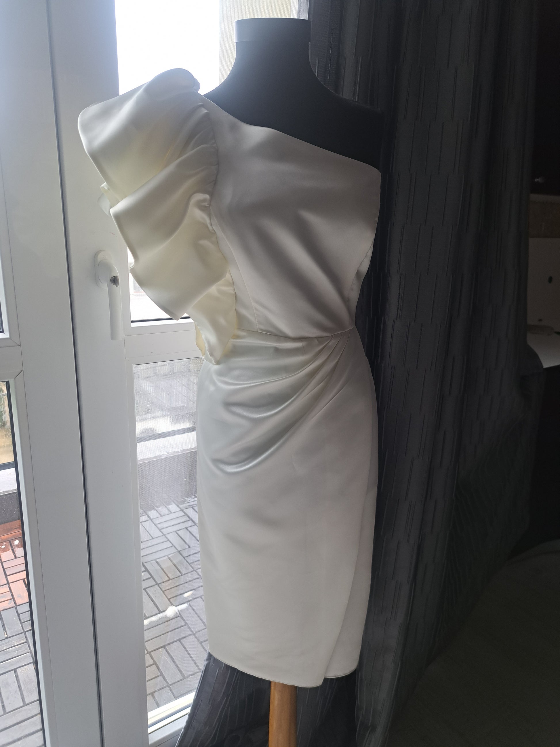 Rochie de ocazie din tafta alba cu volane generoase. Nu vei trece neobservata la evenimentele la care o vei purta.